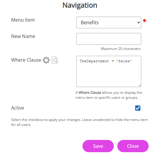 Example: If you want the Benefits menu item to appear only for employees in the Sales department, you would add a TheDepartment ='Sales' Where Clause.